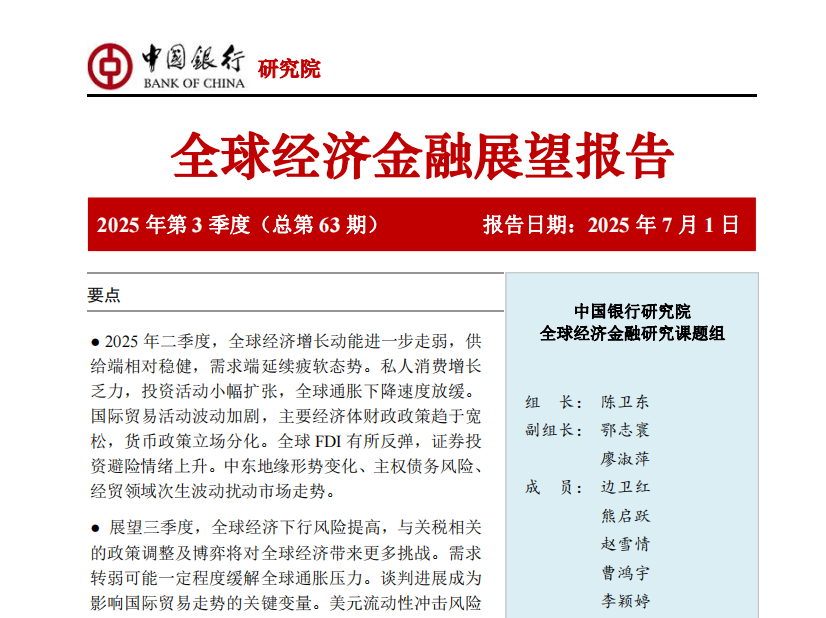2025年二季度全球经济增长动能减弱,需求疲软,下行风险上升。美国经济受关税政策影响增长失速,欧洲弱复苏,日本增长受阻。全球贸易波动,财政政策宽松,货币政策分化。