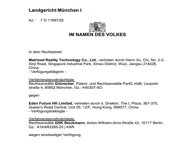据了解,案件始于2025年9月22日。XREAL 针对 Viture Inc. 及其香港运营实体 Eden Future HK Limited 向德国法院递交临时禁令请求,所涉专利聚焦增强现实设备及其光学系统这一核心技术领域。值得注意的是,Viture Inc.在初期并未应诉,直至9月29日法院已单方面批准针对其的禁令后,才于11月7日提交应诉文件,并要求参与11月13日的正式庭审。德国法院经审理后,正式认定侵权事实成立,强化了禁令的法律效力。