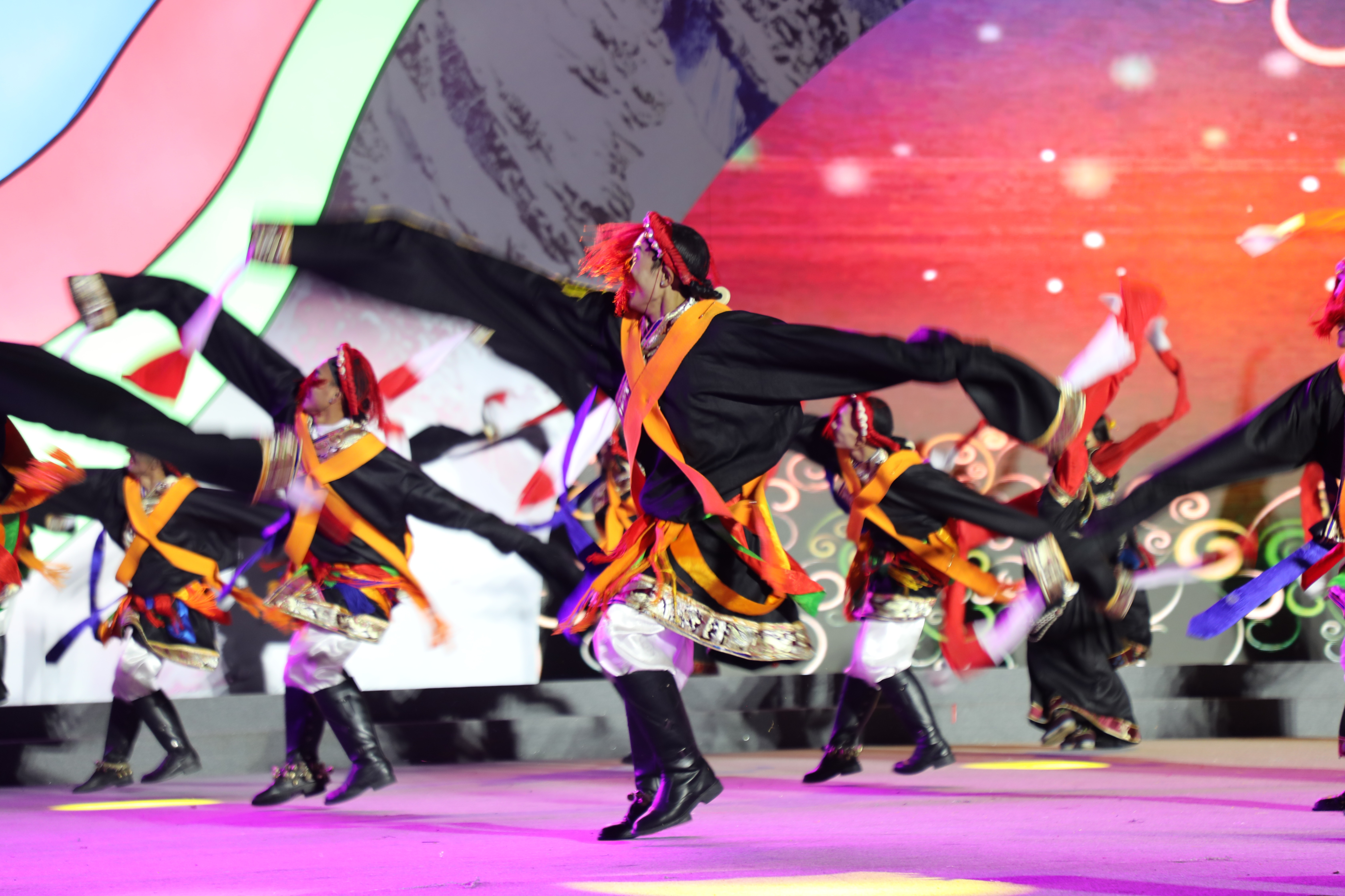2025年8月1日,在青海省玉树藏族自治州举办的尼泊尔商贸文化交流活动现场,玉树州的舞蹈演员正在表演节目。(柳泽兴 摄)